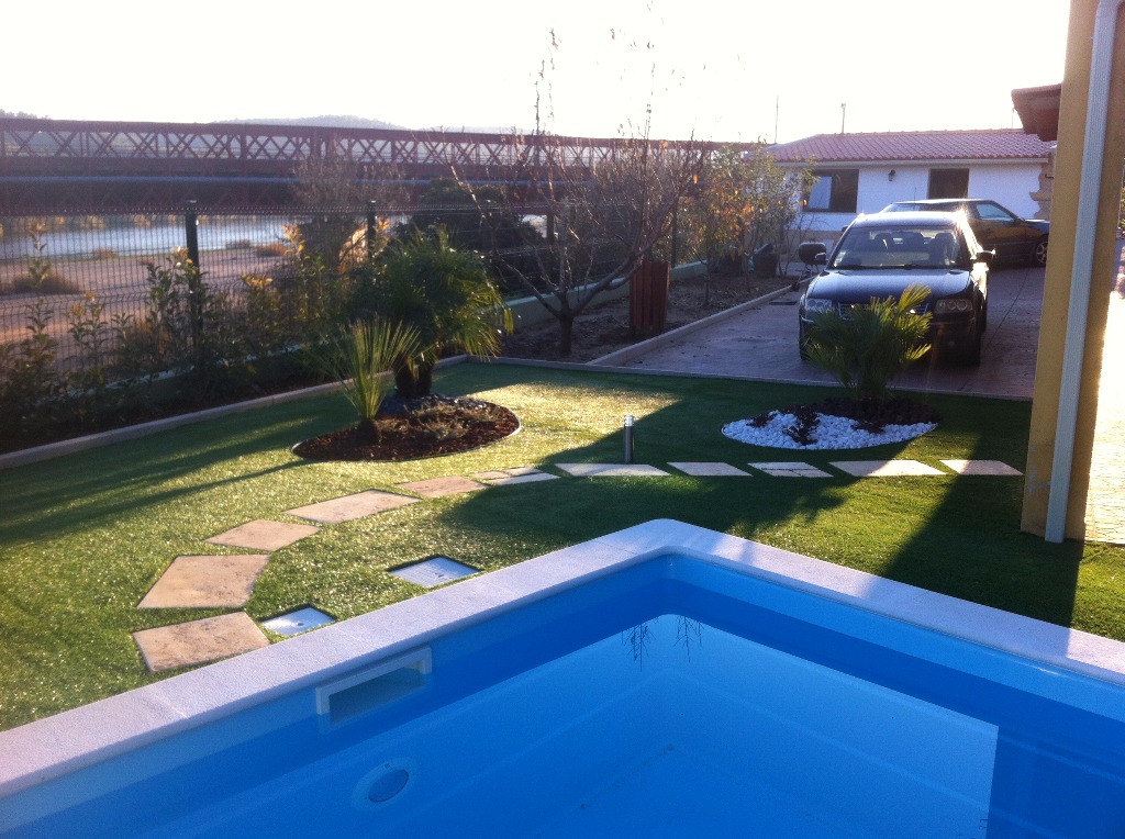Jardim com piscina, iluminação exterior e relva sintética